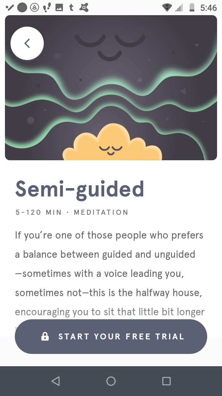 Headspace was the app I used to get started with mindfulness, based on my therapist’s recommendation. The colorful, approachable program presents itself as a teaching tool for mindfulness beginners with a robust library for everyday meditation. Free trials of the premium service run two weeks with an annual subscription and one week if paying monthly.
